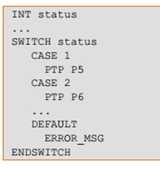 對(duì)帶有名稱”狀態(tài)”的整數(shù)變量(Integer),首先要檢查其值.如果變量的值為1,則執(zhí)行案例1(CASE1):機(jī)器人運(yùn)動(dòng)到點(diǎn)5.如果變量的值為2.則執(zhí)行案例2(CASE2):德國(guó)KUKA機(jī)器人運(yùn)動(dòng)到點(diǎn)P6.如果變量的值未在任何案例中列出(在該例中為1和2以外的值),則將執(zhí)行默認(rèn)分支:故障信息.