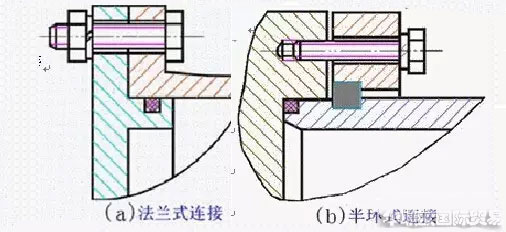 (2)半環式連接,分為外半環連接和內半環連接兩種連接形式,半環連接工藝性好,連接可靠,結構緊湊,但削弱了缸筒強度。半環連接應用十分普遍,常用于無縫鋼管缸筒與端蓋的連接中。