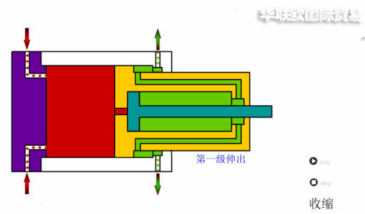 多級伸縮缸:最多可帶4個套簡,收攏長度比標準缸短.有單作用或雙作用,它們與標準缸相比是比較貴的,通常用于安裝空間較小但需要較大行程的場合,