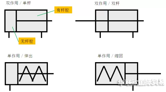 當有桿腔進氣,無桿腔排氣時,使活塞桿縮回。若有桿腔和無桿腔交替進氣和排氣,活塞實現往復直線運動。