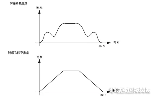 防搖未投入時:起動、停止、加速、減速晃動嚴(yán)重,工件擺動距離為±80cm左右,且需要超過相當(dāng)長時間,工件才能靜止。吊鉤無法正常吊動。且無法在短時間內(nèi)從一工位穩(wěn)定的移至另一工位。