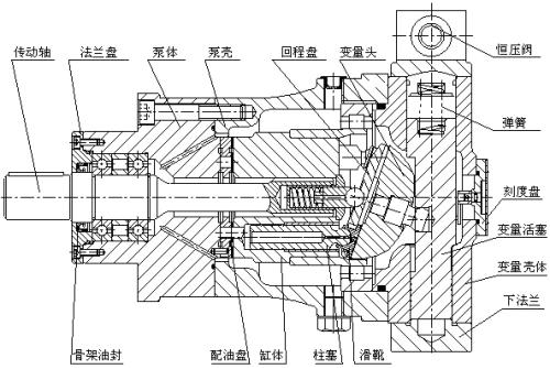 液壓柱塞泵不需要外部的能源,只需要流水的力為它們提供了所需的能量。它們的裝置極其簡單,只有兩個運動的部件,是往復泵的一種,屬于體積泵,其柱塞靠泵軸的偏心轉動驅動,往復運動,其吸入和排出閥都是單向閥。當柱塞外拉時,工作室內壓力降低,出口閥關閉,低于進口壓力時,進口閥打開,液體進入;柱塞內推時,工作室壓力升高,進口閥關閉,高于出口壓力時,出口閥打開,液體排出。當傳動軸帶動缸體旋轉時,斜盤將柱塞從缸體中拉出或推回,完成吸排油過程。柱塞與缸孔組成的工作容腔中的油液通過配油盤分別與泵的吸、排油腔相通。變量機構用來改變斜盤的傾角,通過調節斜盤的傾角可改變泵的排量。