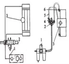 1-氣源處理三聯件 2-三位四通手動轉閥 3-回轉氣缸 4-消聲器 5-尼龍管 6-管接頭