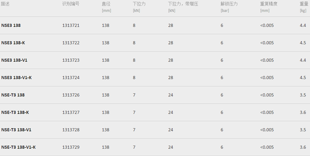 NSE3系列性能是在暢銷系列 VERO-S NSE plus 基礎(chǔ)上,進(jìn)一步提升不僅增大了下拉力,模塊主體的尺寸穩(wěn)定性也得到增強(qiáng)。因此,新模塊NSE3系列能夠吸收更大的傾斜力矩和橫向力。另外,還具有一項獨有功能,可以使用不同配置延長模塊。其最顯著的特征就是可選配一個彈簧驅(qū)動的錐形連接件,能在提起定位銷后立即鎖定模塊的更換接口。
