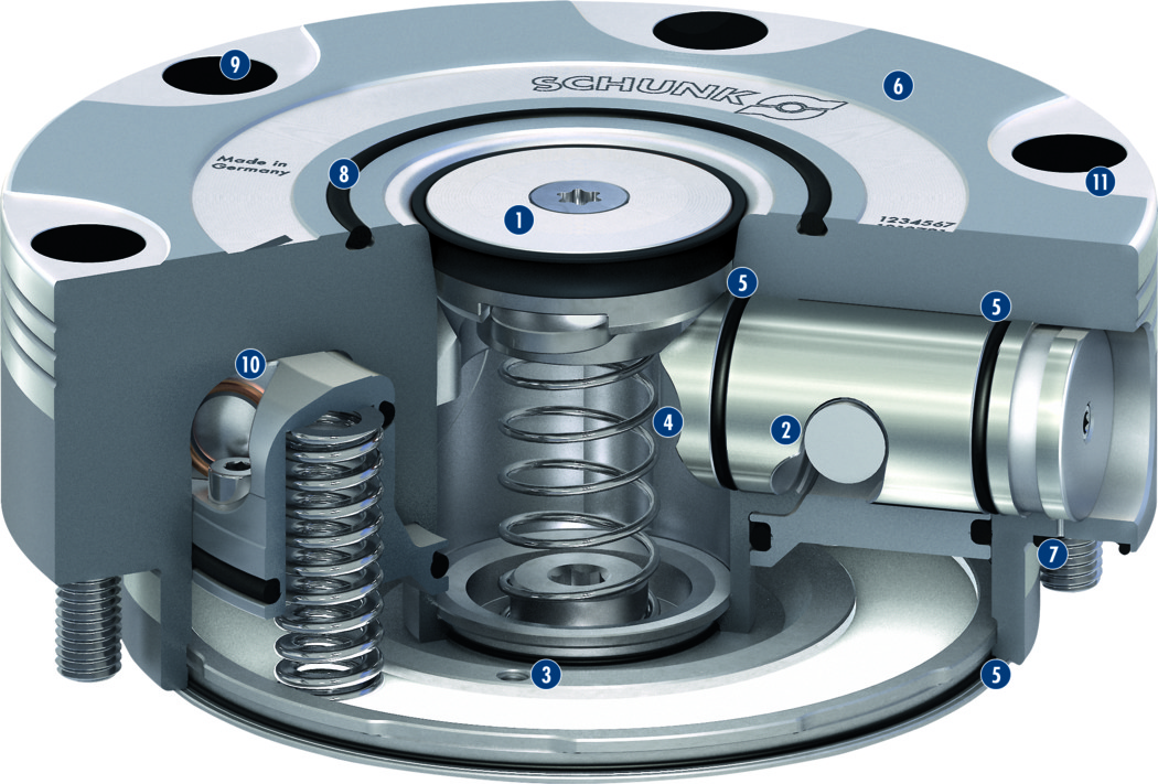 夾持過程由集成的彈簧組件執(zhí)行。動力傳遞通過專利驅(qū)動機(jī)構(gòu)實現(xiàn),它將有效的彈簧力轉(zhuǎn)換為定位銷的最大下拉力。夾持自動鎖定,下拉力可在集成渦輪增壓功能的幫助下增加??墒褂? bar系統(tǒng)壓力打開。