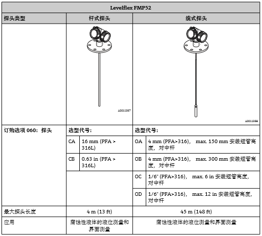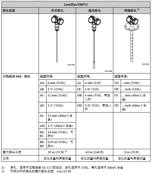 通常,使用桿式探頭或同軸探頭進行液位測量。纜式探頭用于量程超過10 m (33 ft)時的液位測 量(FMP52:量程超過4 m (13 ft)), 以及罐(倉)頂間隙不允許安裝桿式探頭的測量條件下的液位測量。