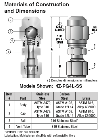 這些閥門沒有帽螺紋密封。必須慢慢打開閥門,操作人員遠(yuǎn)離直接通氣孔或閥門附近。因?yàn)樵跊]有蓋密封的情況下,當(dāng)閥被打開時(shí)少量的介質(zhì)將流過帽螺紋區(qū)域。清洗閥與PTFE球選項(xiàng)需要防漏關(guān)閉只用手指擰緊的操作和設(shè)計(jì)有一個(gè)可移動(dòng)的上限球更換。
