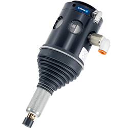 SCHUNK去毛刺主軸FDB-AC系列用于機器人手臂上或作為固定單元,具有高進給速度。在直型和90°型中,裝置以高達30000rpm的轉速由氣動主軸驅動。為了能遵守機加工輪廓的公差,主軸為軸向安置。銑刀頭處的最大距離為±9mm。移動(軸向)主軸需要力(硬度)。其受第二個空氣接口控制。根據壓力不同,作用于銑削表面的力為1N至25N。