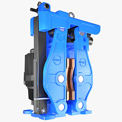 TEXU系列制動器是基于傳統鼓式制動器基本原理的雙作用盤式制動器。與鼓式制動器類似,制動力從兩側對稱地引入到制動盤中。制動時,徑向力不會傳遞到制動軸上。該制動器的特殊之處在于,兩個彈簧管單元與布置在中央的電動液壓釋放裝置并聯作用,同時驅動兩個相對的制動鉗。施加制動時,制動彈簧的力通過杠桿連桿均勻地傳遞到兩對制動杠桿。杠桿對成對運動,并使用楔子和滾輪將分開安裝的鉗子杠桿壓在一起。此外,制動器配備有旋轉聯軸器,當打開制動器時,該聯軸器可確保所有四個制動片上的氣隙均勻。襯里的磨損和增加的氣隙通過磨損調整得到補償。
